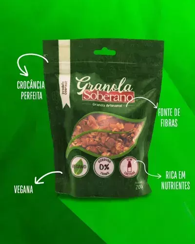 A granola, artesanal, vegana, sem lactose e sem gordura trans, é produzida com aveia, coco, amendoim, açúcar mascavo, castanha de caju, quinoa, chia, óleo de coco e essência de baunilha, proporcionando uma refeição nutritiva e saborosa.
