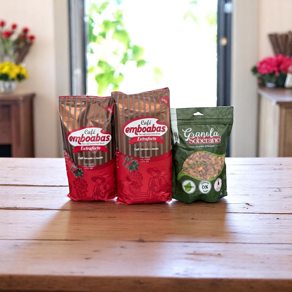 ☕Contém: 2 unidades de Café Emboabas Extra Forte 500g e 1 unidade de Granola Soberano 400g
